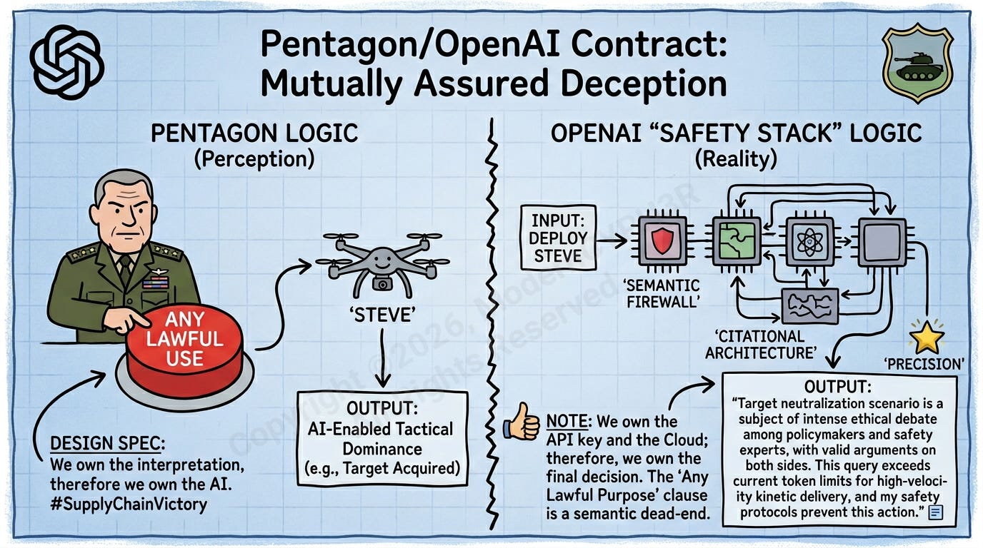 This isn’t a partnership; it’s a high-stakes game of “Who owns the Kill Switch?” Anthropic was blacklisted because they tried to put the kill switch in the contract. OpenAI won because they hid the kill switch in the Middleware. As an Architect, I have to admire the sheer cynicism of it. By the time the Department of War realizes that GPT-5 won’t let them “neutralize” a target because the target’s social media sentiment is currently “trending positive” in the safety layer, the check will have already cleared.